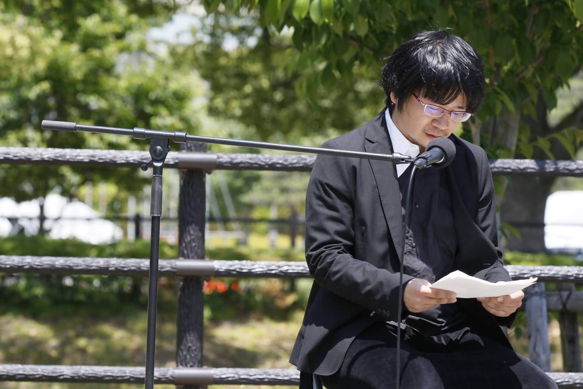 Calling his work "live readings," he travels around the country reading original short stories out loud. He pursues the meaning of words and the way the listener perceives them when they are experienced orally. In addition to collaborating with a wide range of artists and musicians, he also creates new forms of language expression by combining video and live readings, performed using multiple speakers to produce voices from various angles.